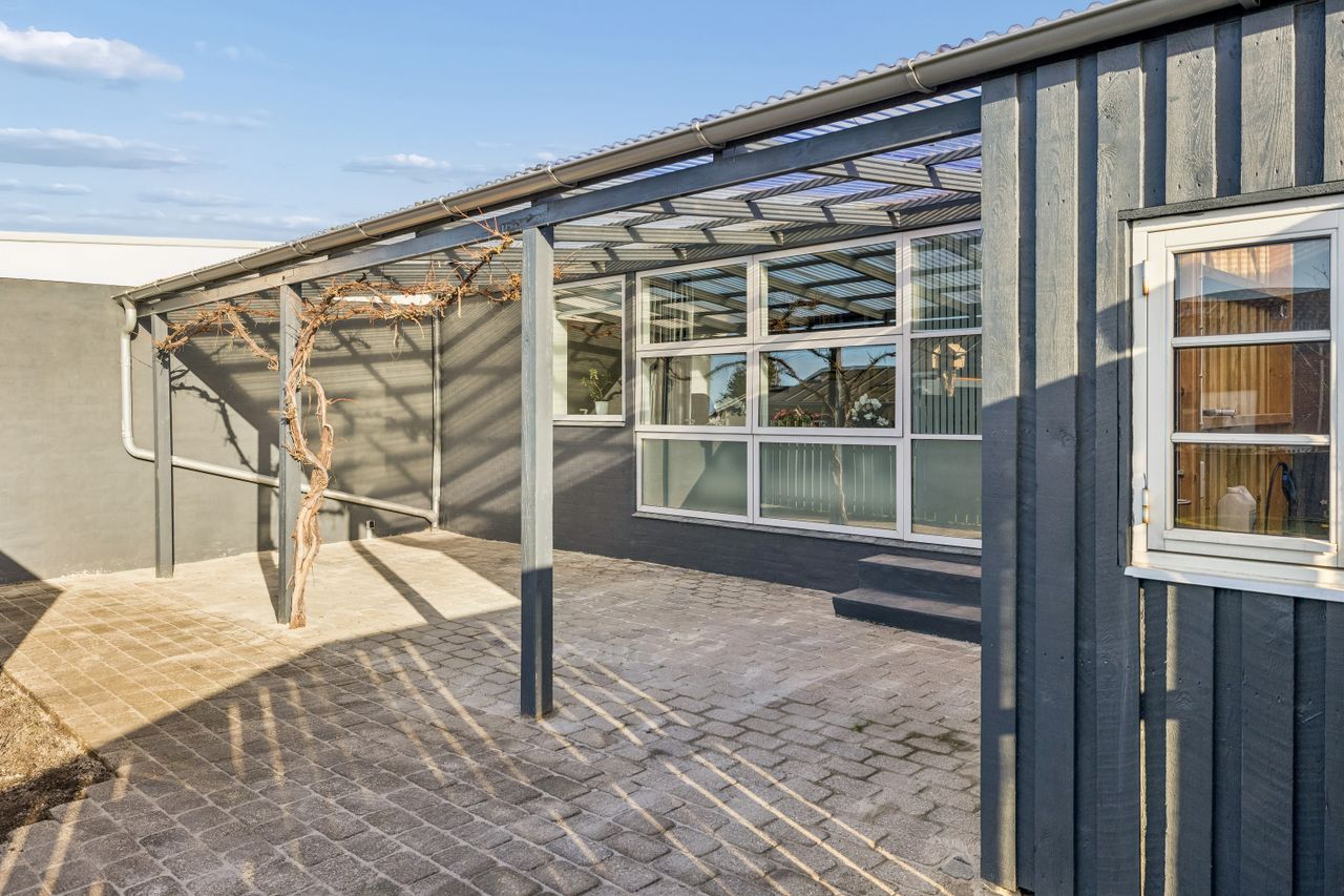 9 m2 carport ved indgangssiden + 5 m2 udhus ved terrasse + 16 m2 carport/udhus med indkørsel fra nabovænge.