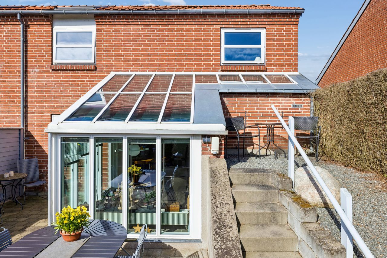 92 m2 bolig der er opført i forskudte planer og indeh. klinkebelagt entre med åben garderobe - pænt badeværelse med bruseplads, hvide vægfliser og klinkegulv med varme - klinkebelagt bryggers/baggang med fast bord/vask/skabe, vaskemaskine, tørretumbler og køle-/fryseskab. Fra entreen er der få trin ned til - pænt køkken der er renoveret i 2023 og med gode hvidevarer - dejlig lys og rummelig spise-/opholdsstue med integreret glasudestue og med udg. til terr./have. Fra entreen er der få trin op til 2 pæne soveværelser med skabe og trapperepos med skabe.