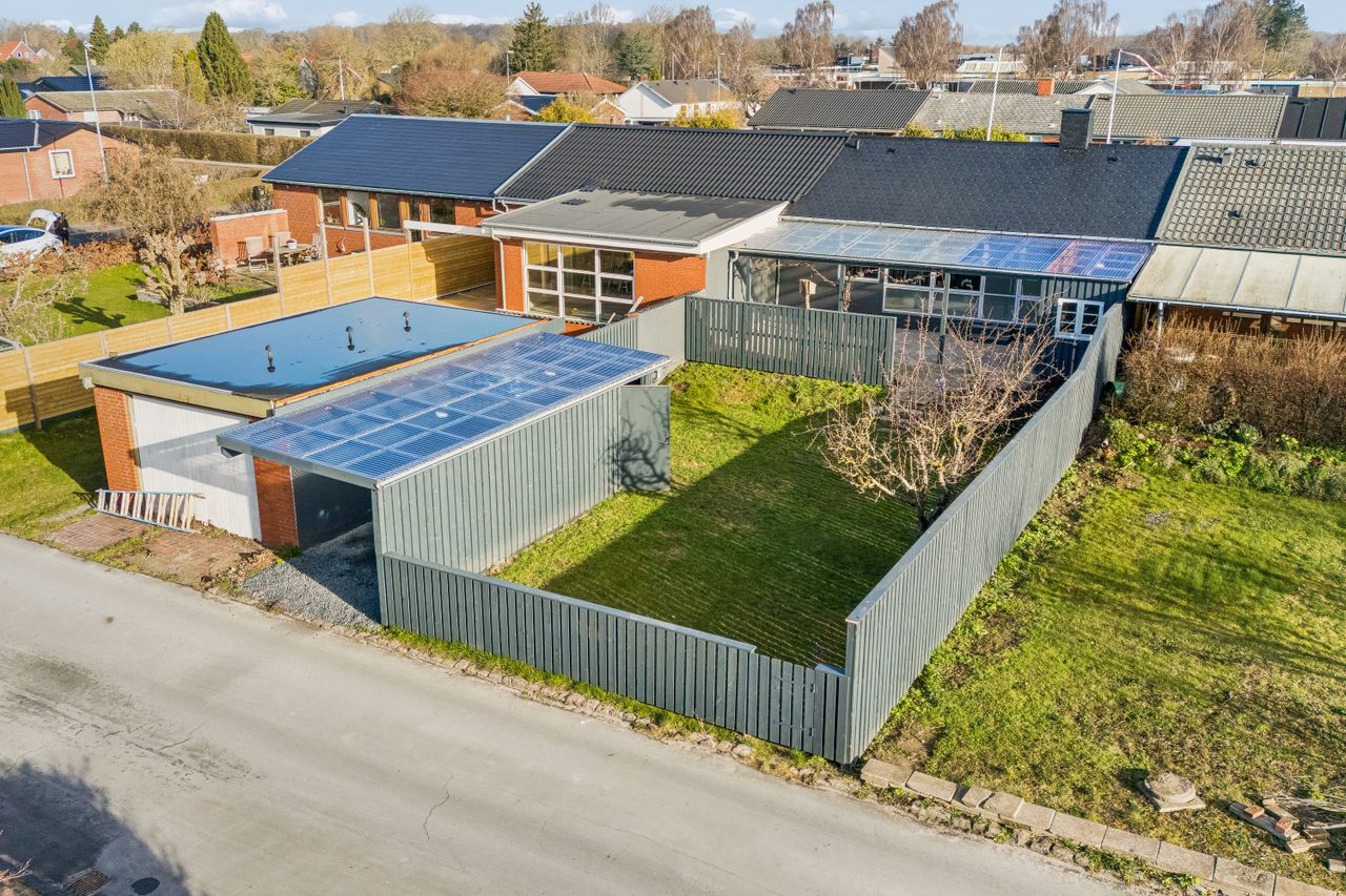 9 m2 carport ved indgangssiden + 5 m2 udhus ved terrasse + 16 m2 carport/udhus med indkørsel fra nabovænge.